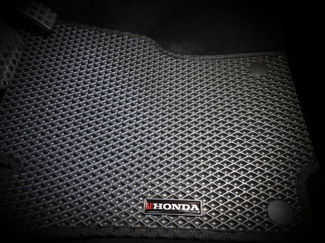 Килимки ЕВА в салон Honda Civic IX '12-17 (у кузові седан, авто для європейського ринку). Колір килимків сірий, колір окантовки чорний. Водійський килимок зроблений із 3D-стрічкою. На килимках встановлені текстильні застібки Velcro (липучки).