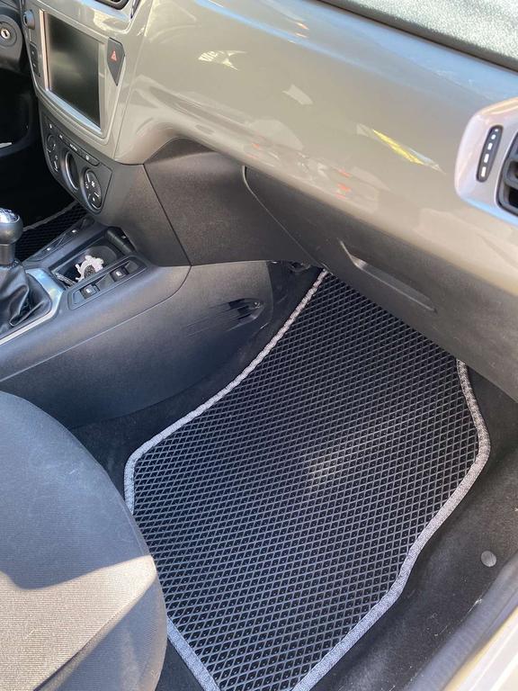 Комплект ковриков EVA в салон Citroen C-Elysee включает в себя водительский и пассажирский коврики, два коврика заднего ряда сидений и коврик на тоннель.