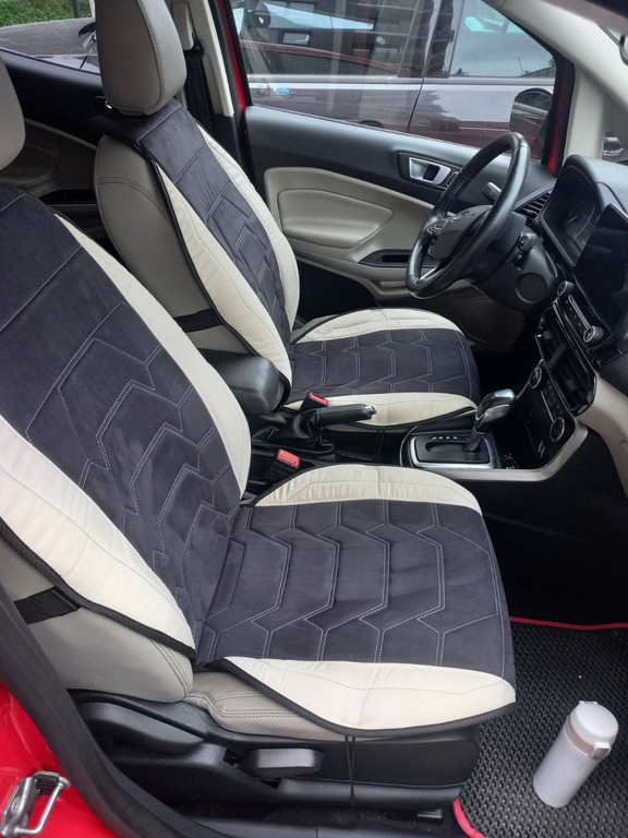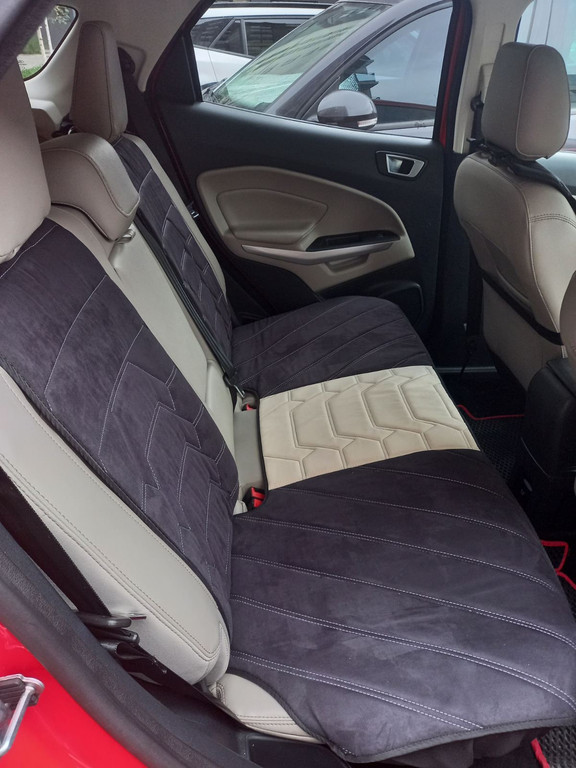 На фотографіях нижче зображені накидки у салоні Ford Ecosport 2 '13-23, що виготовлені за індивідуальним замовленням. Матеріал - замша чорного і світло бежевого кольору, візерунок прострочки "ПАВУК"